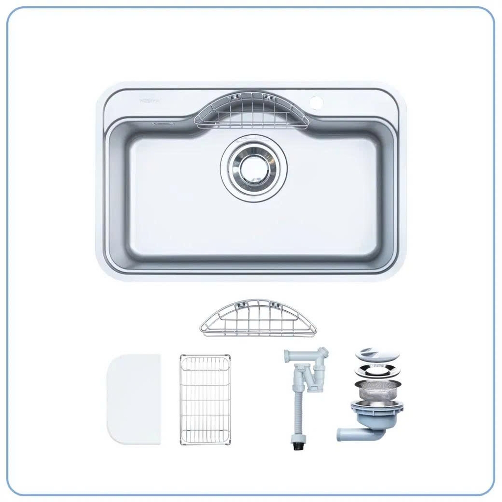 Sản phẩm được trang bị sẵn thớt nhựa và rổ LK giúp tối ưu thao tác sơ chế thực phẩm và úp chén bát. Bộ phụ kiện đồng bộ giúp không gian bếp gọn gàng và tiện nghi hơn.